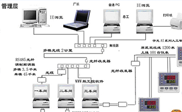 關鍵詞:光纜 監控 以太網一、概述四川制藥股份有限公司在全廠局域網設計中采用光纖深入動力車間兩臺喬納森公司550空壓機運行情況控制,加入調度管理系統,將以太網滲透到工業現場從而實現辦公自動化與工業自動化的無縫結合,給廠部調度室、總工隨時決策提供幫助。充分運用AI系列智能儀表組建現場總線型計算機監控系統連接到局域網上共享信息資源。使車間、調度室、廠辦計算機組成對等以太網,實現資源共享管控一體化。二、系統架構我們將傳統的服務器下放至現場充當服務器,計算機中安裝WWW網絡版工控軟件,現場的儀表數據以數字信號的形式由服務器采集并保存于服務器中。 調節器AI-808AXL2L2S4巡檢儀AI-706MAJ0J0J0L2L2S AI表采集的壓力、流量、溫度、位移、液位、流量等數據存儲在客戶服務器WWW網絡版工控軟件數據庫,在計算機上按裝100M網卡,接上光纖收發器,通過四芯光纜送至500米(可達